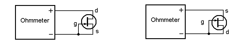 ODM, does this mean that in order to determine which leadl is the source and which is the drain, I should connect the JFET as an amplifier and test the gain (parameter Y21)? I used this method, which shows equal resistances:Originally posted by ODM View PostJunction fets are usually different beasts than mosfets by being symmetric. That symmetric structure means the drain and source can be exchanged. There are usually listings for gate-source voltages etc, but not for gate-drain.Attached Files