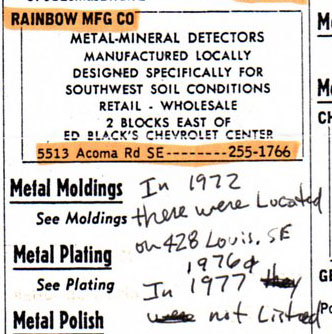 I wonder if any one remembers a company manufacturing the "Rainbow Metal Detector" in Albuq. NM? This company was in business for about 2 to 2 1/2 years. There company claimed that their metal detector design for eliminating mineralized soils that are prevelant in the SW. The detectors (if I remember) looked like Bounty Hunters, I, II and III, (30+ years ago) painted bright gold with a rainbow colored decal. I'm thinking no more than 200 were ever built (or less).