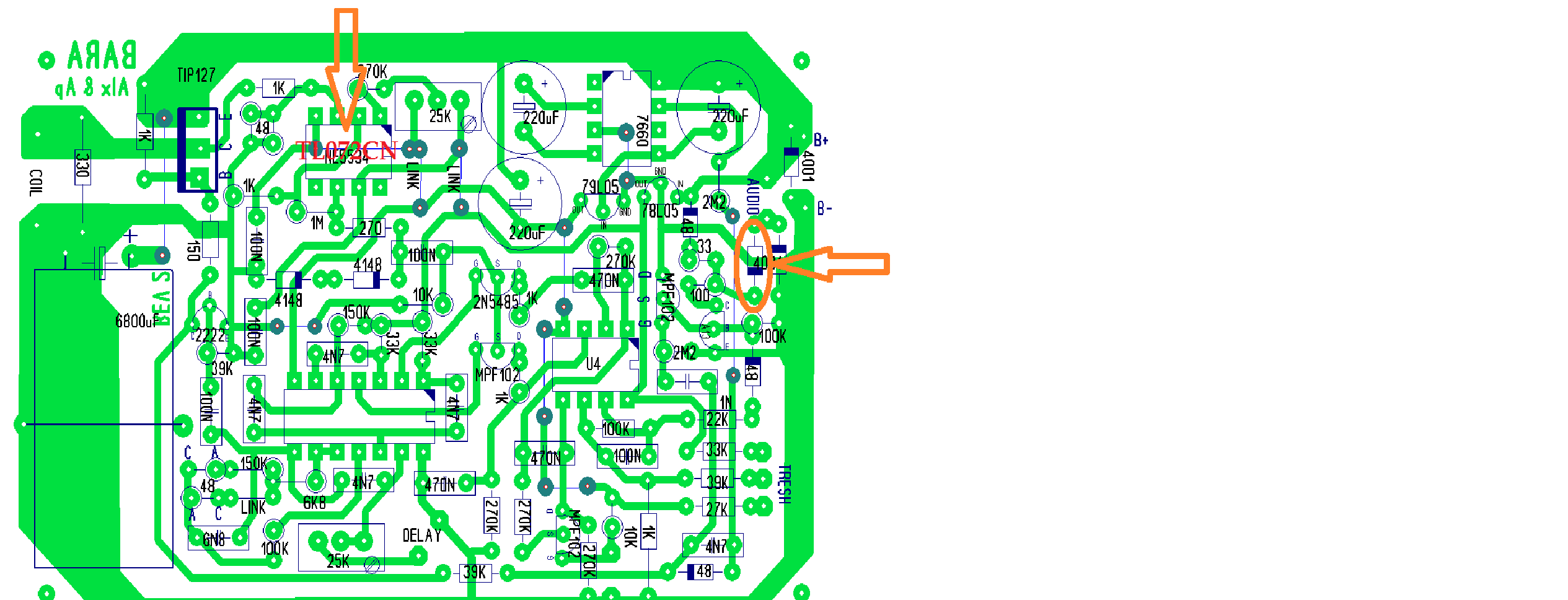 NE5534 is not available and i changed it with LT072CN. Now the DIODE 4001 as seen in picture is getting very very warm so changed the 220uf 35V capacitor with 220uf 25V. I hit the PCB with something and it started producing very faint pulsating beep that would change to a beautiful continuous tone if the PCB mount 10k trimmer is worked counterclock. I switched it back on and it is again silent.