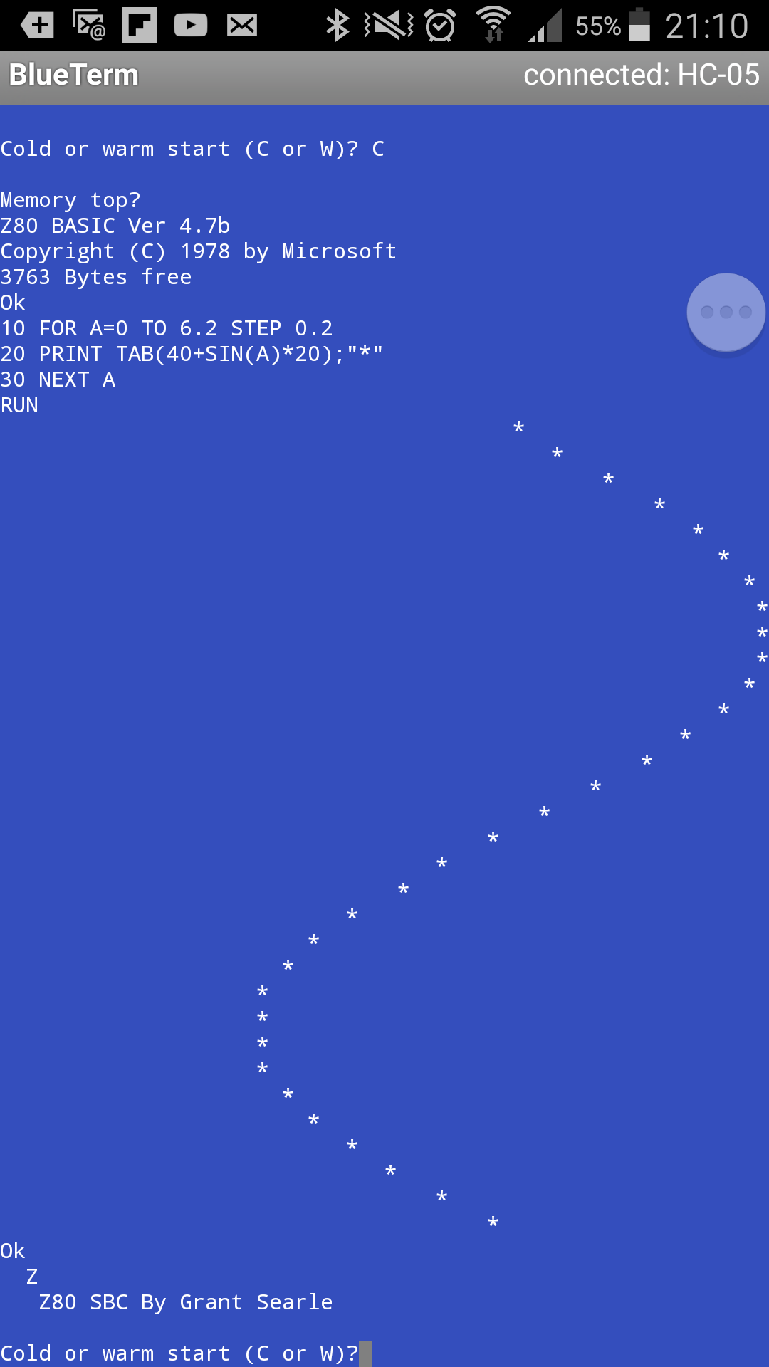 ... A Z80 WITH 4K RAM RUNNING MICROSOFT BASIC OVER A SERIAL ( BLUETOOTH ) LINK TO A TERMINAL ( ANDROID BLUETOOTH PHONE )