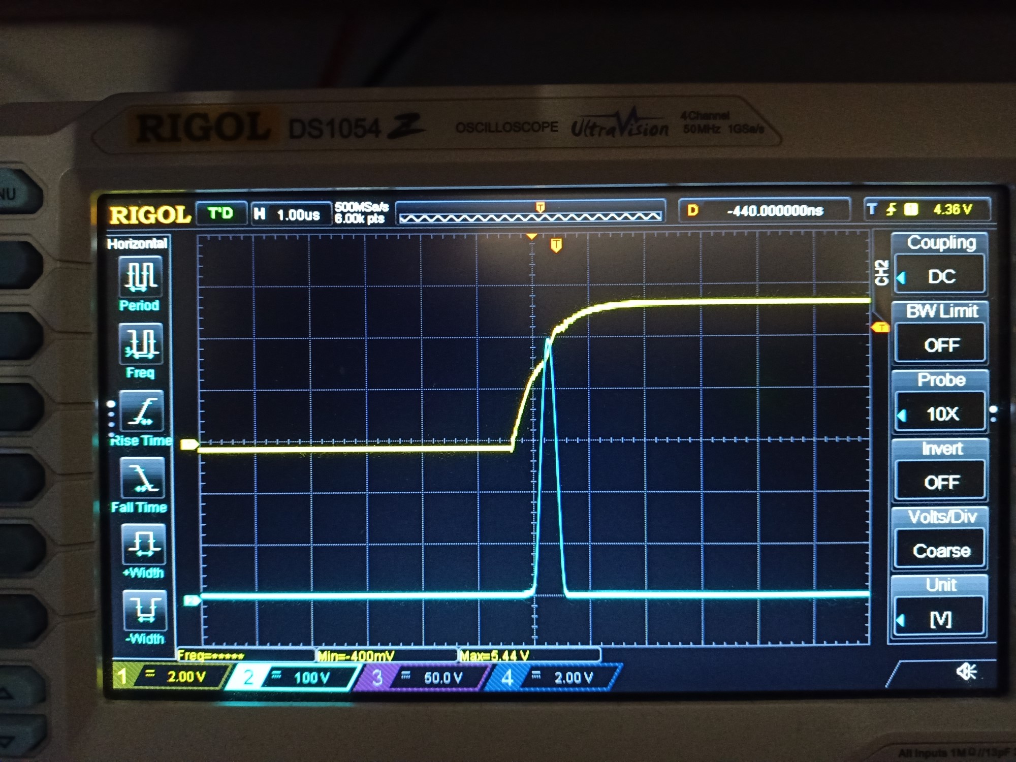 The supply voltage is set to 1.24 volts .... the flyback is higher than the simulation maybe because cascode connected mosfets turn off faster :-) ....