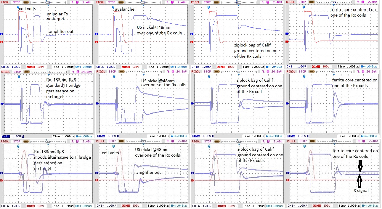 One of my goals lately has been to detect #9 lead shot with a PI. Appears I need to start sample 3.5 to 4us after Tx off or polarity switch(CCPI). Including some scope recordings with unipolar, bipolar and CC Tx that I have been playing with. The ferrite core has the least effect with the unipolar Tx. I have moodz CCPI circuit working with spice. I get more lose with my real circuit when polarity switches so my spice circuit won't work. I like moodz circuit, should be able to increase Tx pps 4times faster than unipolar(1000pps to 4000ps). Haven't given up on moodz circuit yet, need another approach to keeping Tx current constant during target and ground sample time or reducing lose when Tx polarity switches. Any suggestions appreciated other than reducing Tx resistance(would like to use my existing coils if possible)The unipolar Tx seems to work but I think moodz CCPI would be better if I could get it working.