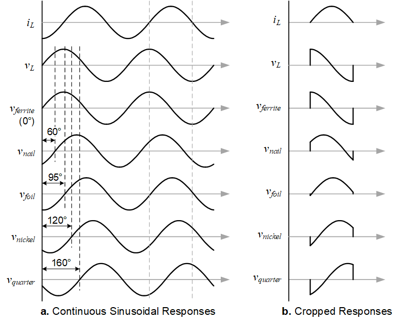 To imagine the target responses start with a continuous sinusoidal response and simply truncate it. Here is a set of plots for some targets at 10kHz. The gray dashed lines exactly frame a half-sine of the current, and the plots to the right are all the responses cropped to these lines.