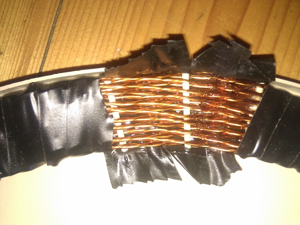 winding detail .... you can clearly see twisted pairs wound flat in basket weave to minimise capacitance. The black tape is ordinary PVC electrical ... there is no shielding.