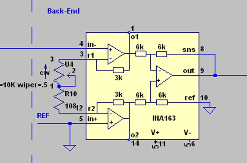 This implementation uses the Buur Brown INA217 @ G=56.5 instead of the THAT1500. The INA217 is pin copatible with the THAT1500. The THAT1500 has much more BW than the INA217. With the INA217 gain set at 56.5 the BW is ~1.5mHz.