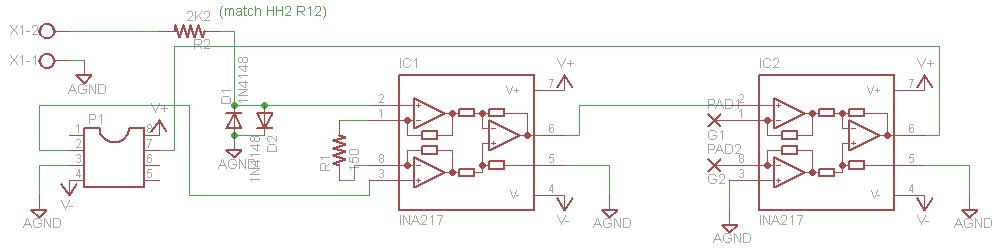 The gain of the pre-amp differential amp (IC1) is set to 67. The HH2 back-end interface (IC2) is also a differential amp with a variable gain of 1.9 – 31, resulting in an overall variable gain of 127 - 2077. The gain is variable by using a 330 ohm resistor in series with a 10K ohm reverse log audio taper potentiometer as RG for IC2 (connected between PADS G1 & G2 of the schematic).