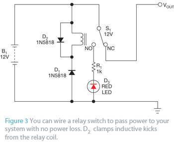 The best way is using a relay and a few components, which draws no current when polarity is connected correctly .