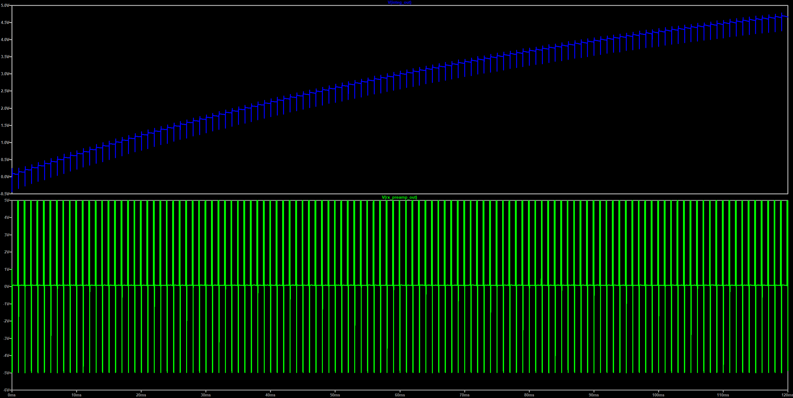 Until I get one, I am trying to theoretically analyze (LTSpice simulation) and understand the operation of the integrator itself. I was already able to separately build the preamp and TX circuit, so I am able to get a meaningful signal out of the preamp circuit. I measured this signal with a scope, I captured the waveform in digital format and I am able to feed it (in the LTSPice simulation) to the input of the integrator. The picture below indicates the LTSpice simulation circuit. The V7 supply is a PWL source generating the output of the RX preamplifier, as I have captured it with the oscilloscope. I have simulated the Q2 and Q3 transistors with ideal switches.