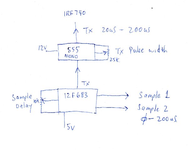 The idea is to drive a IRF740 fet from the 555, and use the two sample pulses from the12f683, altra's code uses a pot to externally change the sample delay timing. The samples are set at about 15uS, with 200uS spread.