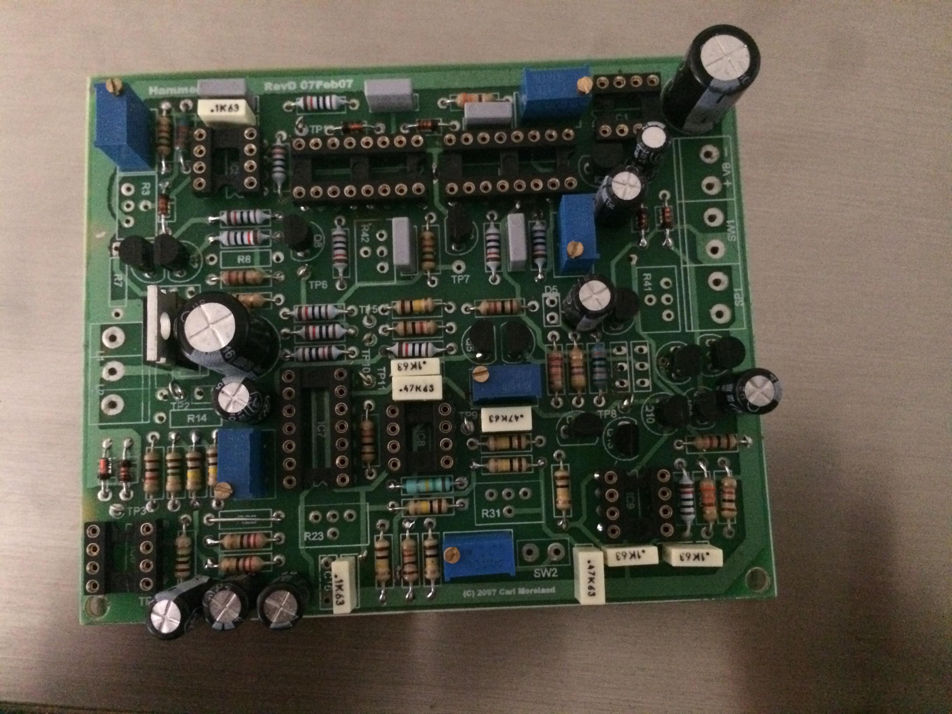 Due to the fact that a commercial board is out of stock I made a double side pcb without plated through holes so the soldering was a pain on parts such as capacitors etc.
