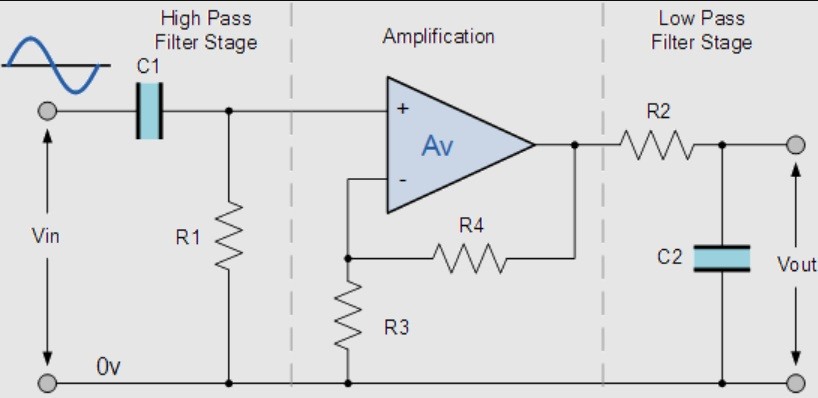 C1,R2 form the high-pass filter and C2,R3 are the low-pass filter. It would be a good exercise for you to put this in Spice and see how it works, and how to change the values to get the frequency range you want.