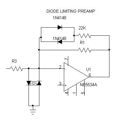One other thing you might want to try is something that I came up with that was posted on another forum and that is to add a diode and resistor combination across the feedback resistor of the preamp. The basic design was posted on the PI forum by another guy to whom I had sent the idea, so I will show it here. Now, if the gain is changed from the original, then the 22K resistor will have to be changed. You could experiment by using a 25K pot, and may find you will have to go down to a low value of 2K or maybe less at reduced gain.