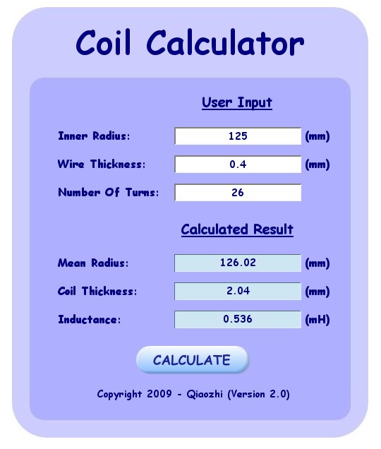 26 turns, 250 mm diameter, 0.4 mm wire: 1.215 mH