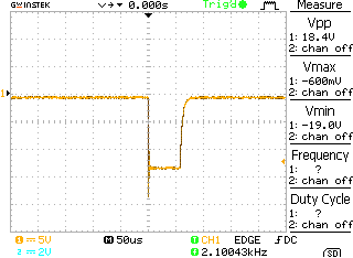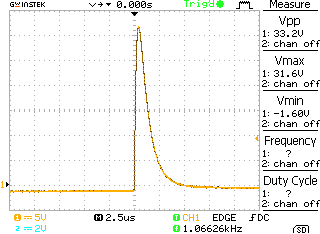 Note how the decay happens over a period of about 5us (even with the original [slow] Minipulse coil). Note the use of a x10 probe. The flyback voltage is measured as 316V.