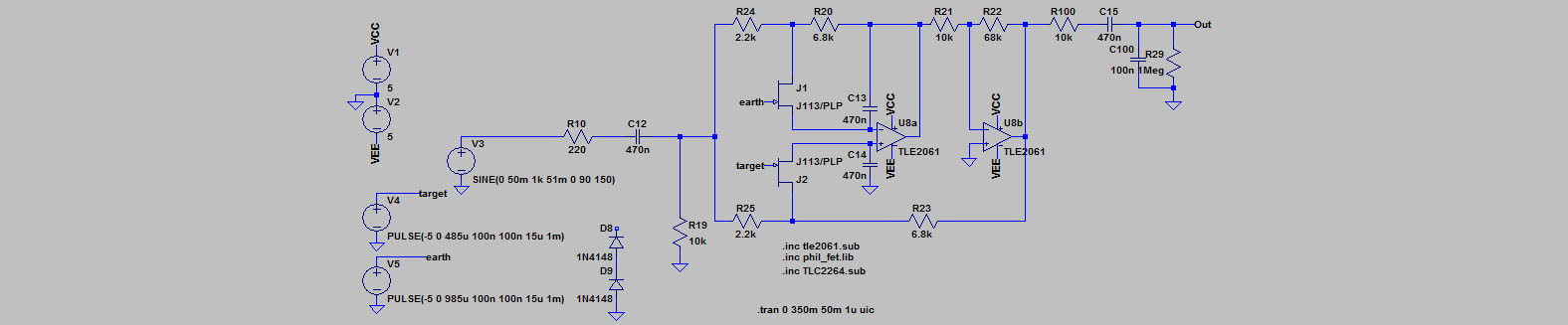 This of course is modified by the sample width and the filtering of the input and output circuits. My Minipulse Plus implementation with 15 usec samples and additional filtering of the output (a 10k in series ahead of C15 and 100n in parallel with R29 ) results in an effective gain of ~1.75 and a 6 dB cutoff of 11.5 Hz. I determined the effective bandwidth by using the FFT function of the simulated output.Originally posted by KingJL View PostGain is R23/R25, LP cutoff is 1/( 2×3.1416×R20×C13 ), band stop is 1/( 2×3.1416×R24×C13 ).