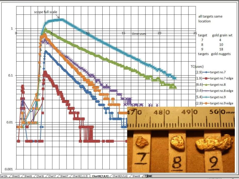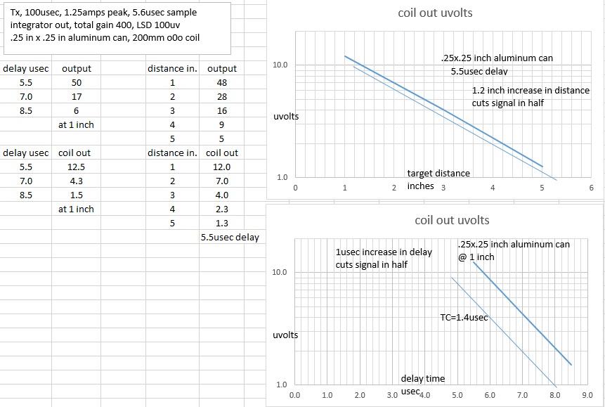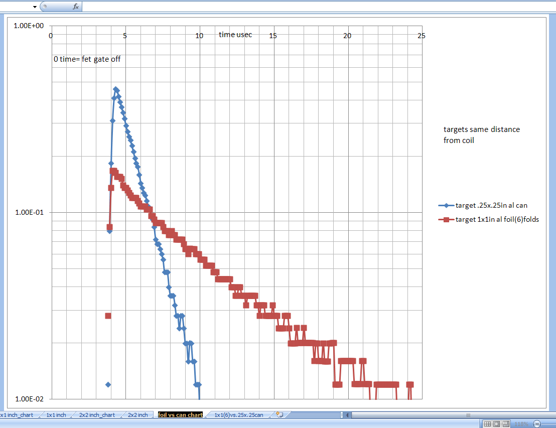 I agree. I had charted the .25x.25 aluminum can awhile back. Charted more data to get a feeling what it might take to detect it at 6 inches. Not the same as KR's MPP but should give an idea of the variables. Both charts show a TC of about 1.4usec.
