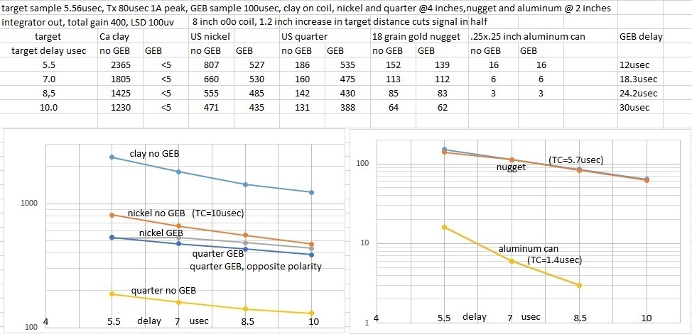 • Reply #274 I charted amplitude vs delay time for a .25x.25 in piece of aluminum can. Added more targets, California clay, US nickel, US quarter, 18 grain nugget and piece of aluminum can. Included a chart of gold nuggets I did awhile back. The TC's varied between 1.9usec and 6.6usec. The piece of aluminum can decays faster than any of the nuggets I tested. The nugget and aluminum can decay faster than clay. Adding GEB reduced the nickel, increased the quarter and did little to the nugget and aluminum signal strength. For the shorter TC targets 5.5usec or 7usec delay would be better.
