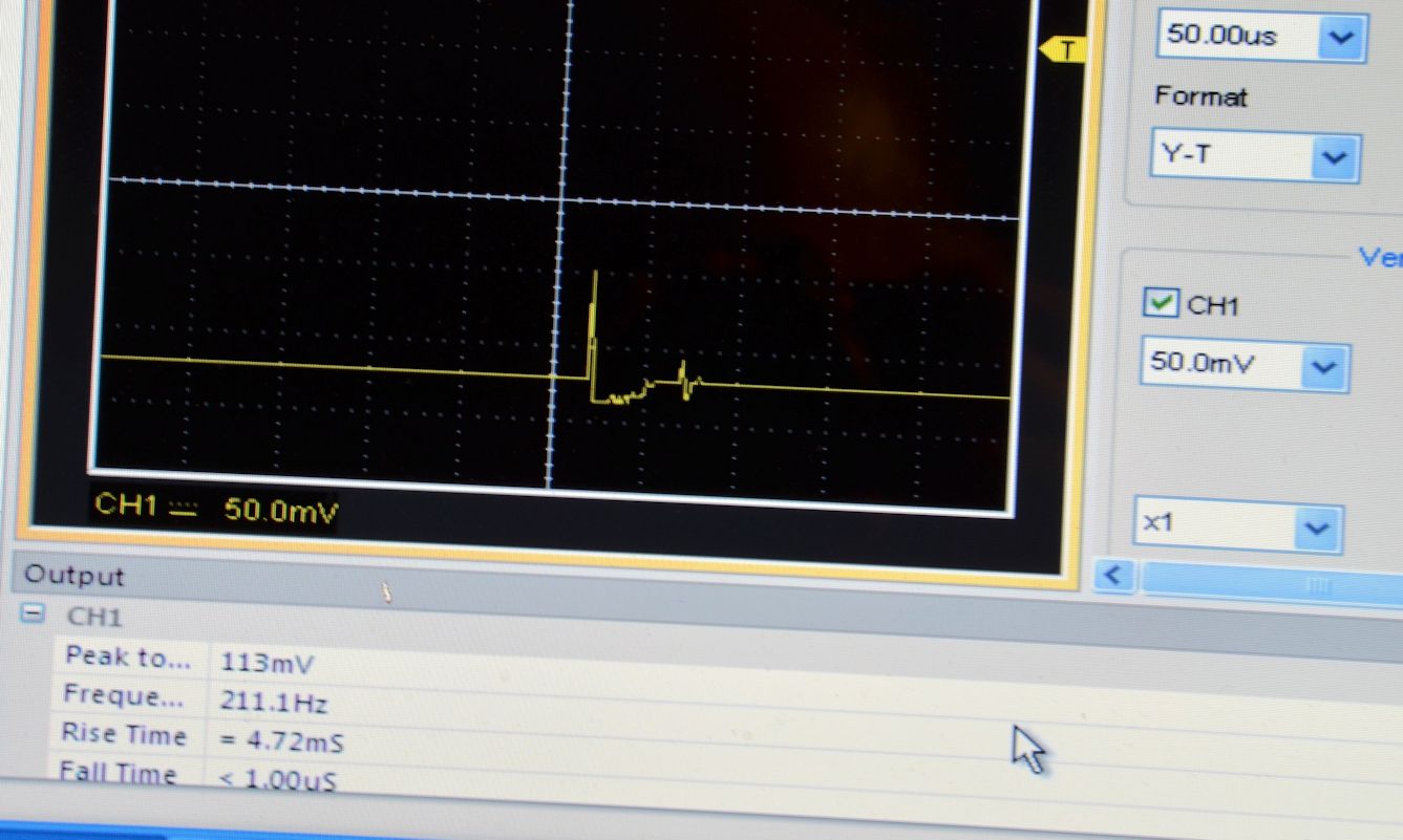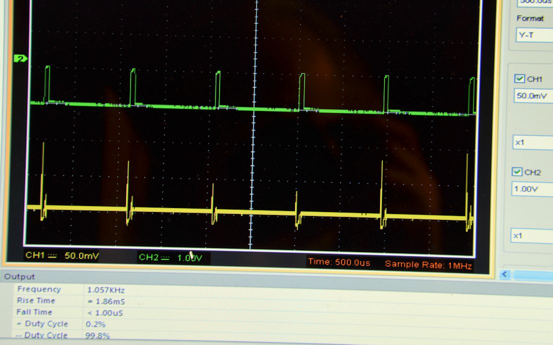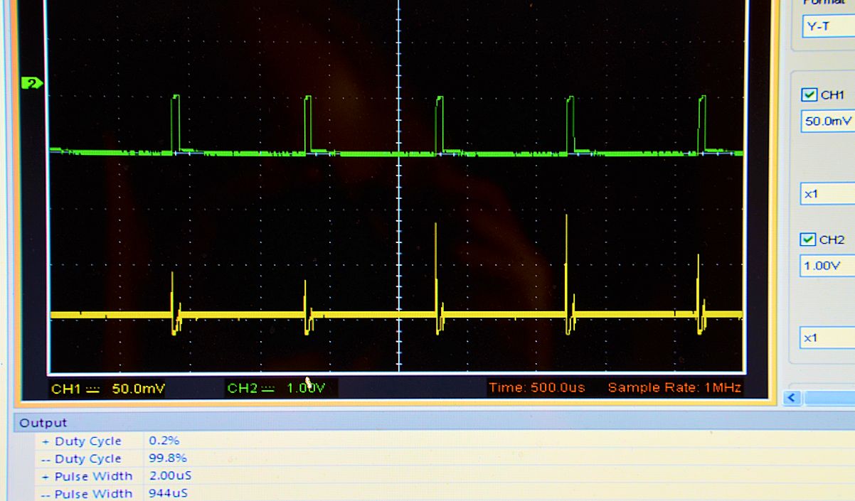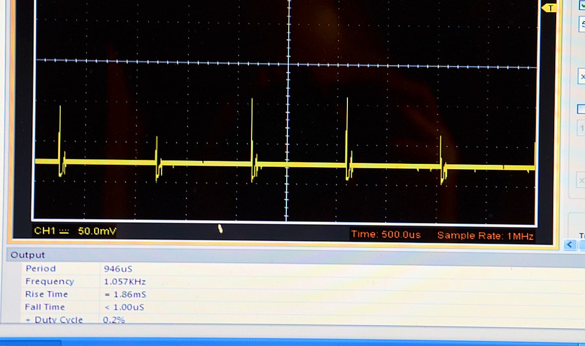 I reinstalled the MOSFET and R1 resistor. TP1 remains the same. I have tried to get a larger sample rate. The directions state the Max real time sample rate is 48MS/s. Guess that means you have no control, the system displays real time, no exceptions???? It is a very simple, $89 computer based program. Hantek 6022BE version 1.0.4