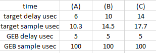 Yes, that's about right. Tuning of this method is achieved by varying the delay to the first sample, which is not a micro-friendly approach. Knowing your appreciation for micros, you'd be better off by modifying the scheme that will shift the GB sample left or right. You may design various schemes following the same ratio rule. If you observe the scheme above, you'll notice that the ratio of pulse duration to its end time is exactly the same for both target and GB pulse.