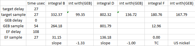 Wondering if anyone has tried GEB by adjusting timing with the MPP integrators and had it work. I've measured ground decay slope between -1 and -1.5. For me, Tx on time having the greatest effect on slope. Including a chart of times I have used for GEB. Not saying what's best, now I adjust delay time and then adjust target sample time for GEB with delay time between target sample and GEB sample time and GEB sample time fixed.Originally posted by green View PostThink changing sample time with the MPP integrator doesn't work for GEB. Varying sample time changes the cutoff frequency not the gain of the integrator.