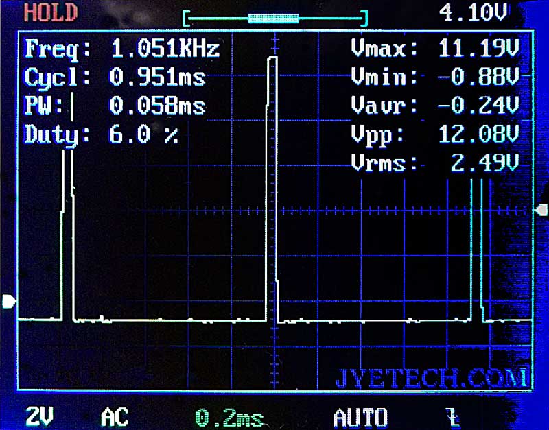 Looks like the frequency is very close at: 1.051kHz the pulse width is bang on target at: 0.058ms 6% duty cycle.