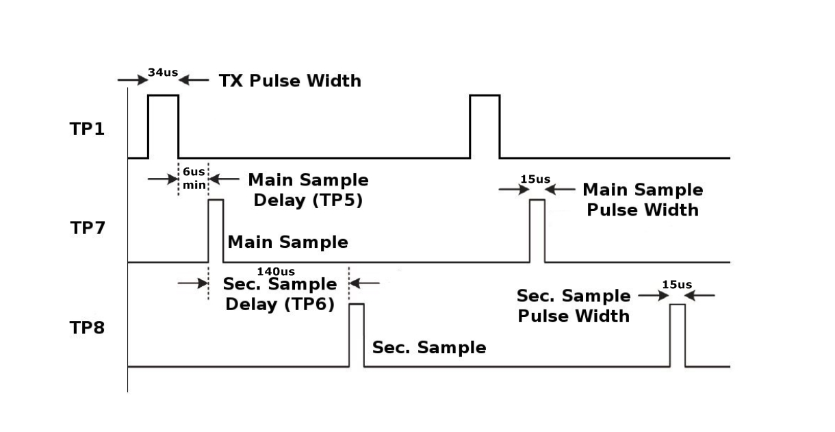 Scope settings are coil pulse (TP4) 1v/div-10us time delay - sample pulse (TP7) 2v/div-10us time delay. Coil is 7-1/2" 3dss with 175/46 litz, 31 turns, 2.1R double layer wire wrap. Sample delay set to minimum 6us.