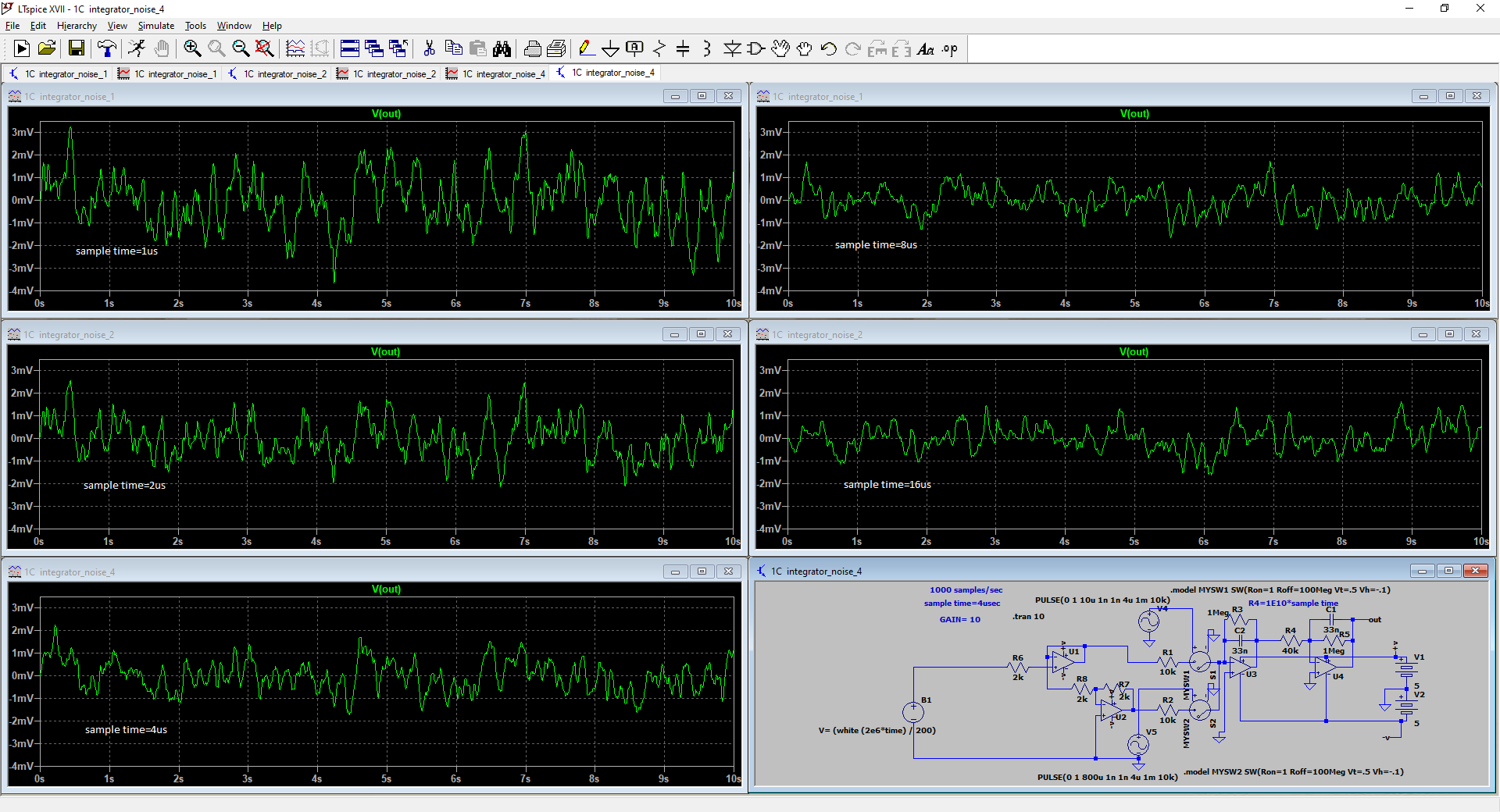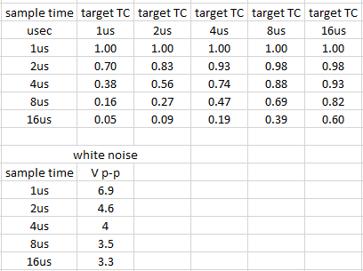 _2 was calculated with Excel. If gain is kept at 10, longer sample times can reduce the output signal a lot. Charts output at sample time/output with 1us sample time.