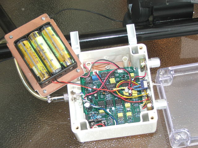 The electronics are sandwiched between a couple of sheets of copper clad pcb to provide some shielding (yet to be connected up) and the 3 Li cells (ex laptop battery pack) mount onto the top pcb shield for easy charging access. I plan to add an led voltmeter next to them to monitor their state of charge. I have also fitted protection boards to each cell. The cells are individually charged in a Nightcore charger so they should remain balanced.