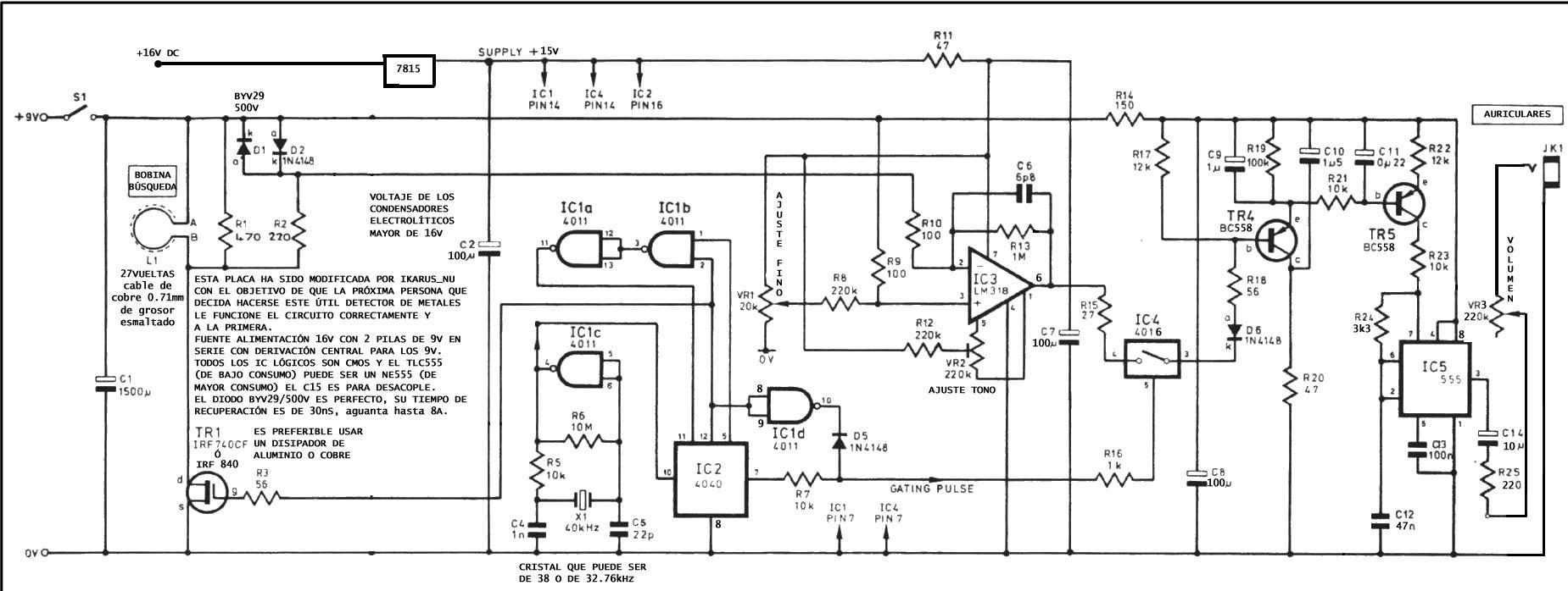 hi im from south africa and i built the first mark stuart EE Treasure Hunter but i am having problems with the pcb it seems that i cant get the voltage any higher than 9v (battery supply) it is supposed to be 16v after the voltage converter. i get no sound through the earphones at all. all the components are correct and i have checked the circuit over and over and everything is the same as the circuit diagram on your web site. maybe you can help me please. if you know of any changes to the circuit diagram or may be im doing something wrong.