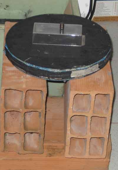 The first pix shows the DD coil, sitting on some red clay bricks. On the coil is a transparent plastic box and on the box a steel lug.