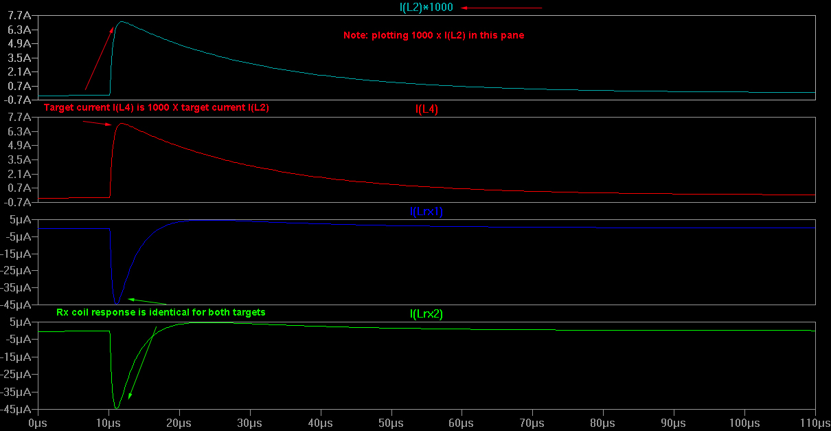Also we have a two identical simulated Rx coils, one for each target. But... the responses in the Rx coils are identical even though one target has 1000 times the amplitude response than the other.