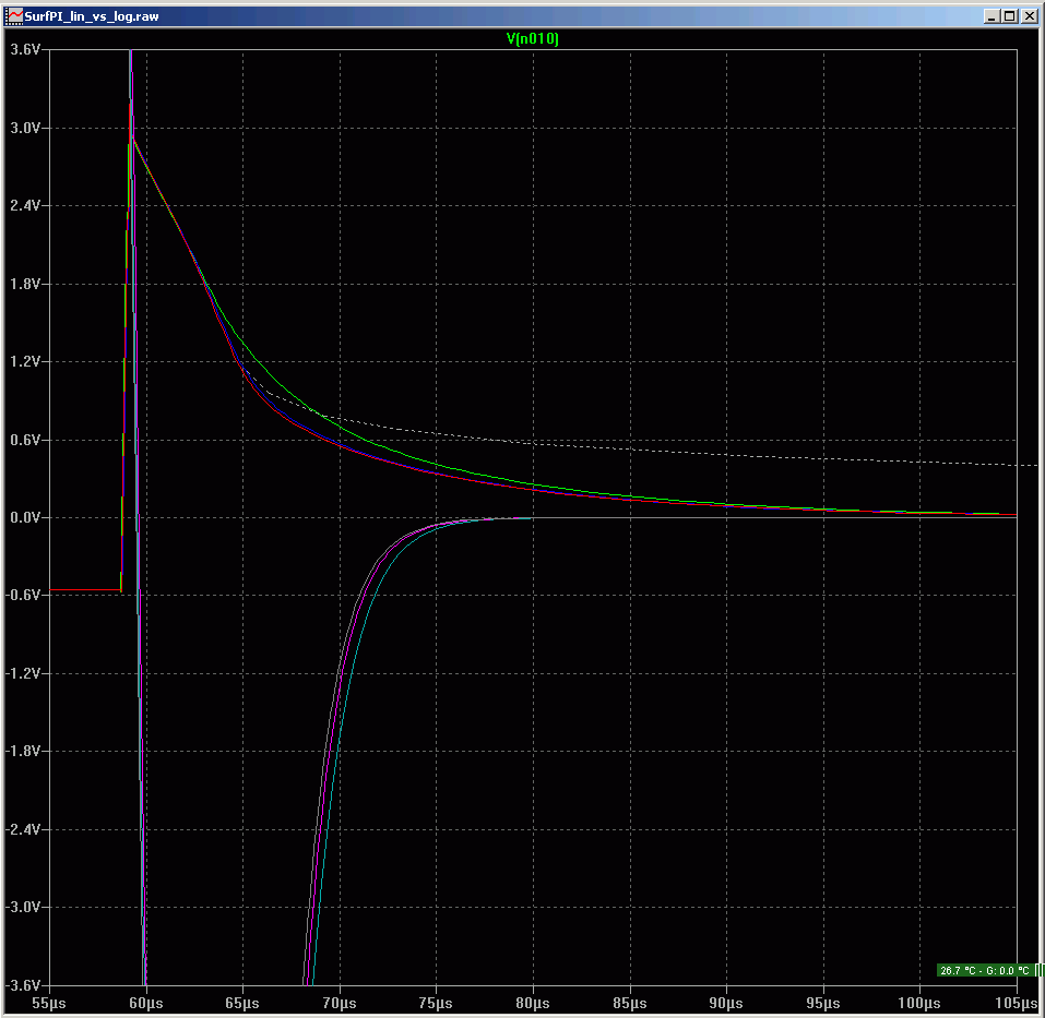 Common feature of all log amps is flat top and bottom where the log curve hits its limitations. On the bottom side there is a (mostly) linear part that is usually buried in noise .. but not necessarily so. With the design I posted previously I can decide how deep the curve follows the log law. By addition of a single resistor in the existing design in a feedback path I can assure a fixed gain for low signals, and detection as usual. 2.2Meg fixes gain to 100 which is same as the "Surf" counterpart below. I traced the response without the resistor for comparison (dotted line). There is something else apparent there: the response is not symmetrical against "Surf" response, and "Surf" response (for no apparent reason) quenches much faster.