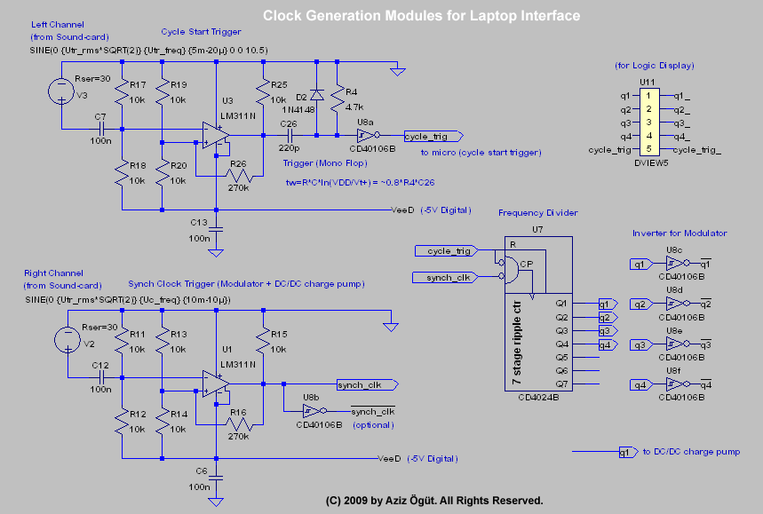 I will go on with the below clock generation modules coming days. The schematics is already simulated and tested with LTSpice. Both channels can be operated individually. Right channel is for the modulator and DC/DC charge pump. So the right channel could run first to drive the DC/DC charge pump and to build up the +5V analog power supply. Left channel is for triggering the cycle start and synchronizes the clockings of the modulator stage on every cycle. The modulator is not shown yet. Minor changes could happen.