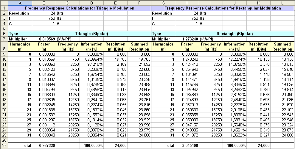 Taking four harmonics would achieve a resolution of 23 bits of 24 (triangular). The other modulation would achieve only 17 bits. The calculation is made upto 31 harmonics. Of course, the response is an infinite response. The table below gives just a good comparison.