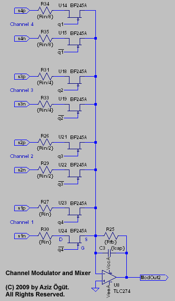 The channel modulator will be realized as an inverting integrator circuit with 8 switchable inputs via JFET's. The inverting pin of the op-amp is a virtual ground point, where the source pin of the JFET's will be connected. The digital switching voltage 0/-5V can then drive the gate directly (easy usage). The frequency dependent attenuation of the integral can be compensated by taking different input resistors of the channels. The modulator and mixer uses only one op-amp.