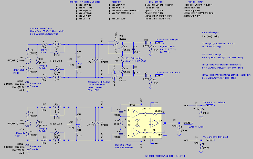 The RX coil must be a center-tapped coil. The center-tap will be connected to ground and will allow a true differential usage. I will use both input lines of the sound card to increase the dynamic range by 6 dB. This will reduce additional noise on cables too. The RX amplifier will be a "half instrumentation amplifier" implementation, which provides differential signal output. It's gain can be adjusted by a simple resistor. A dual op-amp (NE5532 or a better one) will do this perfectly. There is no need for a true instrumentation amplifier (expensive). The gain should be between 10 .. 100.