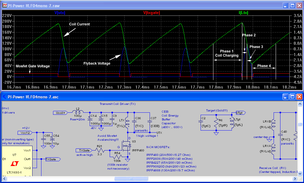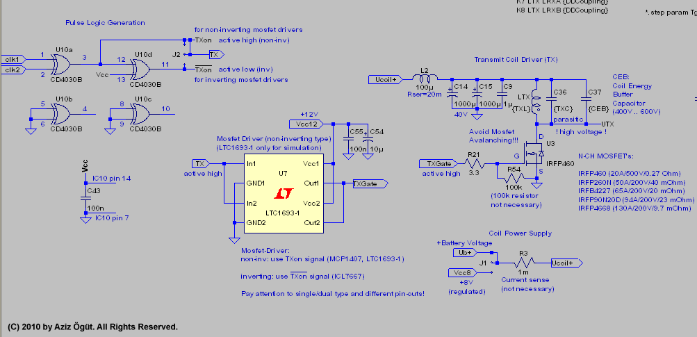 The transmit coil: Simple single ended and shielded coil with low resistance. Something in the range of 300µH to 1mH or more (it depends on the application and timing). The coil will be driven with the battery voltage without regulation. The battery voltage diminish should cause a drift, which can be compensated in the software automatically. Maybe the +8V/1A could also provide a low power regulated supply. As the transmitter is very power efficient, it should deliver enough current. For all, who like more power in the transmit coil, just take the battery voltage.