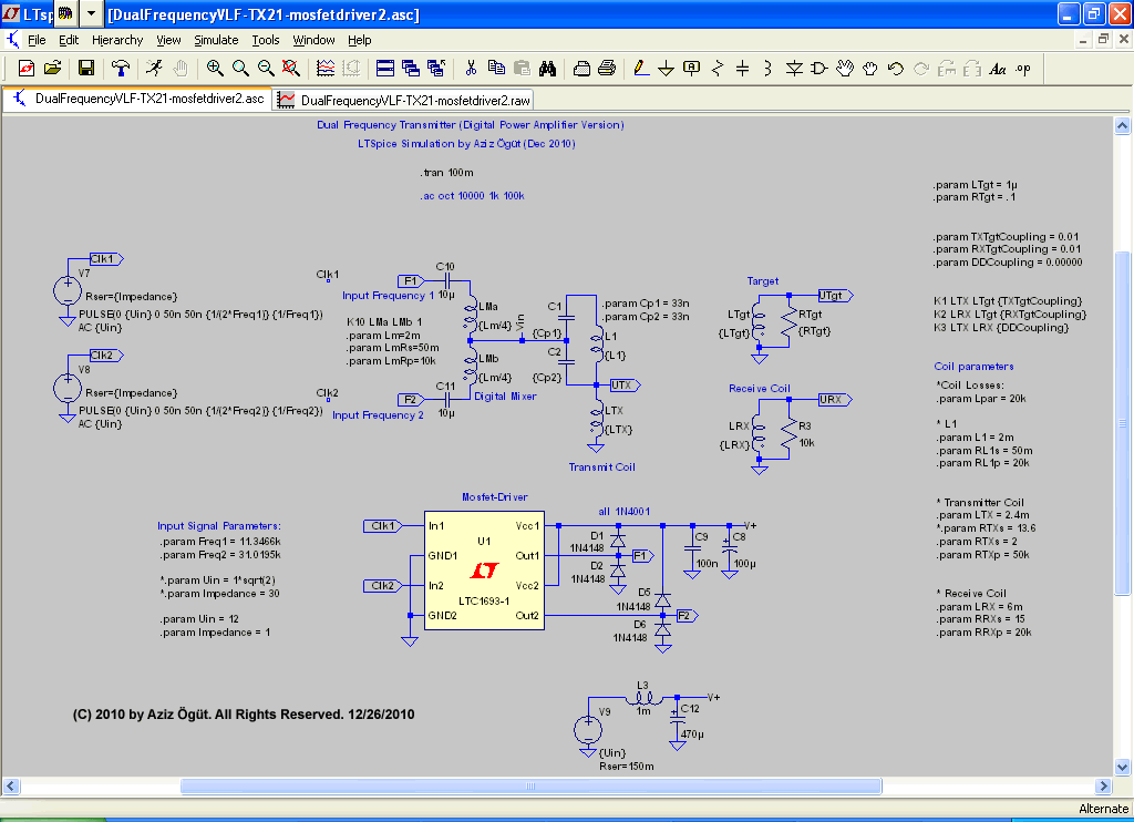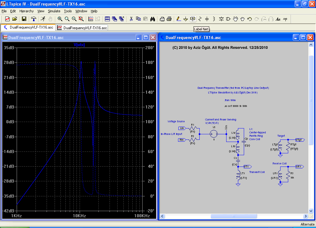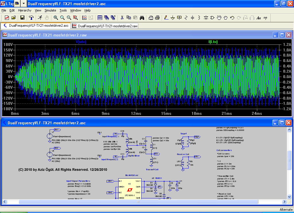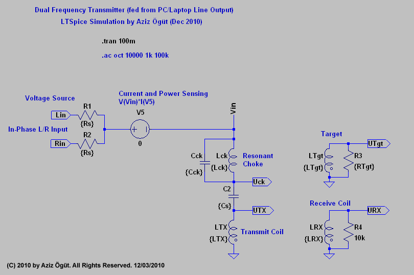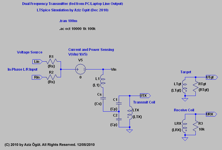 It's a very simple implementation. See below the circuit principle. The capacitor Cs and Inductor LTX is the series resonant tank (for the higher frequency f2). The capacitor Cck and choke Lck is the parallel resonant tank (dominating the frequency f1). The LRX is the receive coil as an induction balanced configuration. I have put both stereo output signals from the sound card to lower the signal source impedance (from 30 Ohm -> approx. 15 Ohm). The Resistors Rs (R1 & R2) are typically very low (1 Ohm). But a single voltage source is also possible.