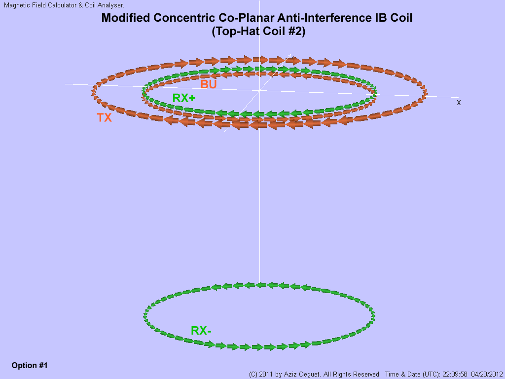 Just exchange the coil position of RX+ and RX-/TX-Bucking coil bundle in the "top hat" coil design showed in post #1366 (http://www.geotech1.com/forums/showp...postcount=1366) and invert the winding orientation of the TX-Bucking coil so it opposes the TX coil winding orientation. This is a typical modified standard concentric co-planar IB coil with the anti RX coil placed above the coil embodiment. Fine balance with distance variation of anti RX coil.