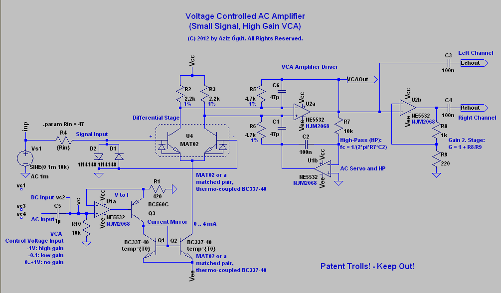 this is the voltage controlled amplifier (VCA) I want to try out soon (see below). Notice, it is a small signal high gain VCA. A second amplifier stage is added and is sent to the right channel.