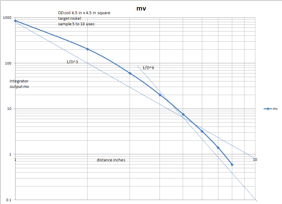 I am trying to build a PI detector. I've been playing with a square DD coil, 4.5 x 4.5 inches. I started small to save wire while playing. I thought square might be easier to build. I'm including a graph. My questions are. Does the graph make sense? Would a round DD coil be more sensitive? Would some other shape be better? Would making the coil 10 or 15 inches change the answers?