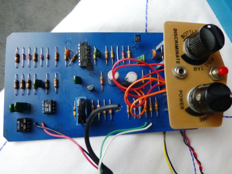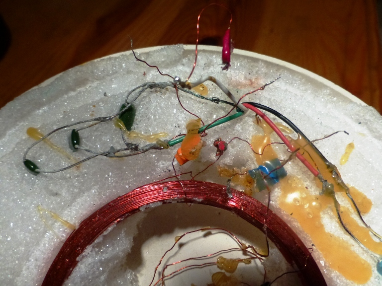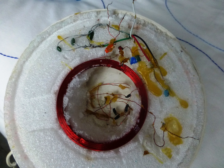 Thediameter of this coil should be 5 and ¾”, according to the dimensions of thegroove in the polystyrene bed where the windings laid . (The receive coil is 2and ¾” it appears to be a 32 wire gauge and has 3 parallel capacitors to linkit with the TX coil. The middle tappings that go to the red and black wires hasa 0.1uf cap across too ). The leads from left to right is first coil end to thecable screen (and supposedly to first coil end of TX?) second and thirdwindings go to leads Black and White (with cap across them) and coil end is aloose 15” length end which will also connect to the TX coil.