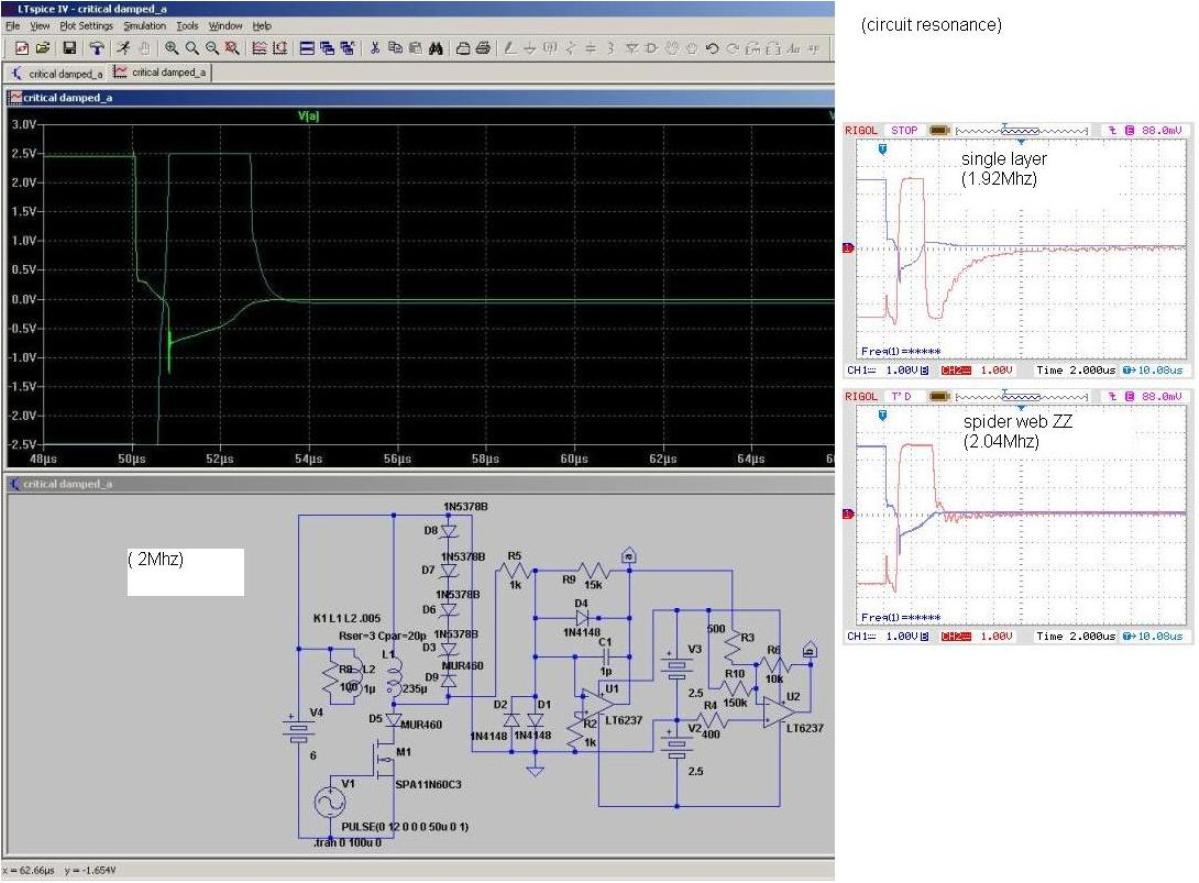 Made a single layer vertical 3-1 to match 3-1 spider web ZZ. 22 turns about 230 uh. Both have a circuit resonance around 2 Mhz with R damping removed (not shielded). Got some overshoot with the vertical coil shielded, so I removed the shield from both. Used 1k for R damping (R5) with the bench circuit and LT spice. With Lt spice the circuit critical damps with 1470 ohms. I've thought I found why the overshoot before but it keeps showing up. The zeners were added in LT spice so the circuit would clamp the same as IRF740 in the bench circuit. Any idea why two coils with about the same specs would act so much different?