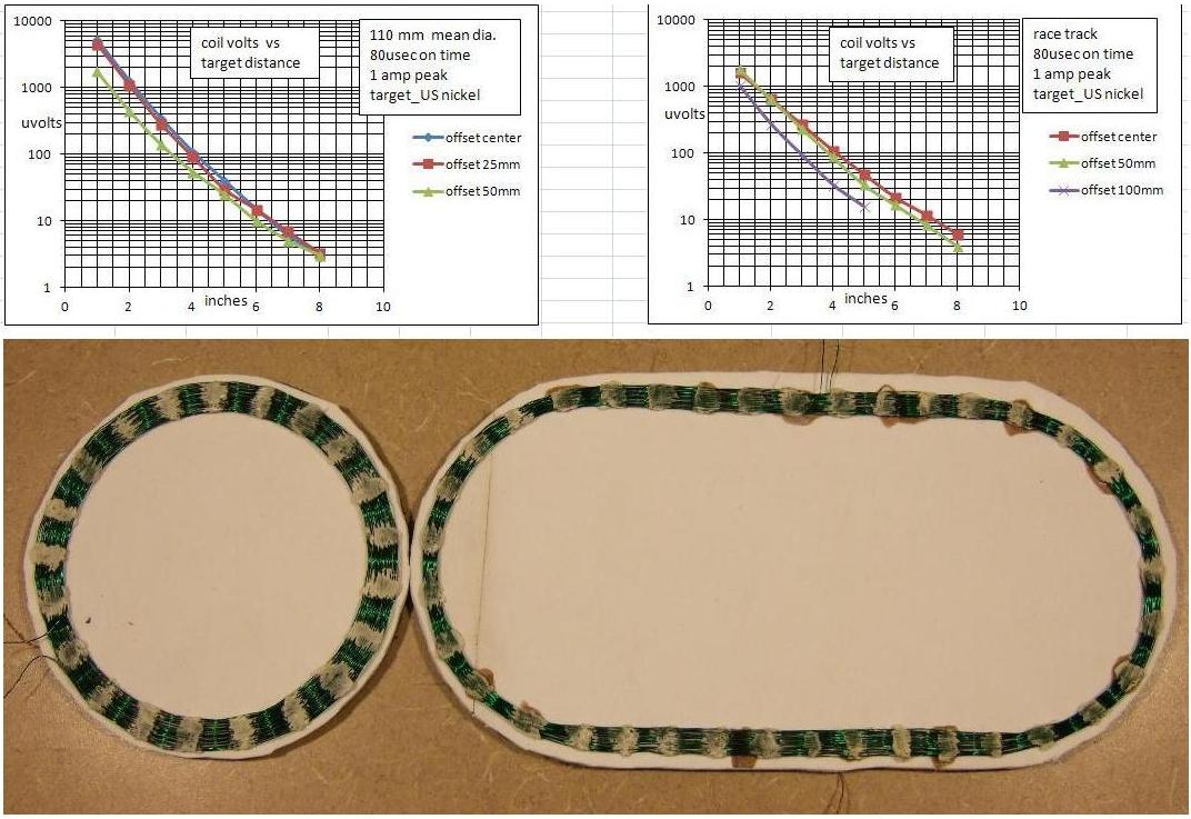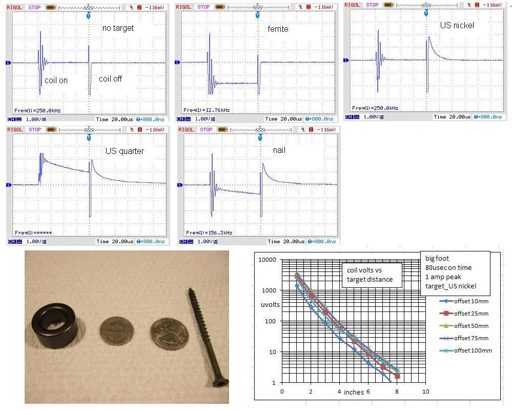 Hi Chet, Finished the big foot with two 110mm round coils for Rx.and a racetrack coil around them for Tx. I changed the coil driver to current control(constant rate, 12500 amps/sec), 80 usec on time, 1amp peak current. Gives a flat response during on time for ferrite and ground. Planned on taking a sample at the beginning and end of on time to discriminate ferrous, non ferrous. Got some oscillation at the start of on time.Don't know why yet, maybe doesn't mater. Looks like ferrous signal change is opposite polarity at end of on time and first sample of off time. Lost some signal strength over mono coil, but the meter readings were more stable. With amplifier gain of 300 the 100u volt digit changed 1 count where it changed a few counts, varied with time with the mono coils. The Rx coils are 210 uh each giving 420 uh in series. Almost not able to sample at 6 to 10 usec. Think I need to use a difference amplifier and grounded center tap for the Rx. The US nickel didn't show during on time because it decays before the oscillation ends. A reply in another thread stated the big foot coil works good for pin pointing. Looking at the chart I would agree if you can see both polarities. The null in the center is quite small. Looks good on the bench, hope it's as good on the ground. The coil is IB, but I still get a spike at turn on and turn off. Scope traces are amplifier out. Forgot to turn scope frequency display off, doesn't mean anything.Originally posted by Chet View PostHi Green