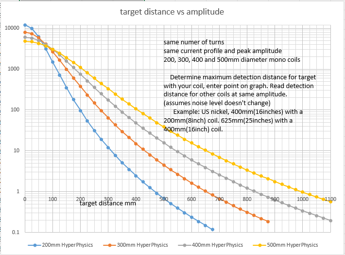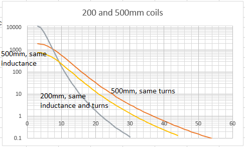 Receive amplitude is proportional to inductance(Tx_Ampere turns, Rx_turns or turns squared) so I calculated what I thought a 300mm coil should be and played with squaring something until I got the same answer. Don't know if it makes sense. Should have checked with inductance increase the first time I charted same number of turns.