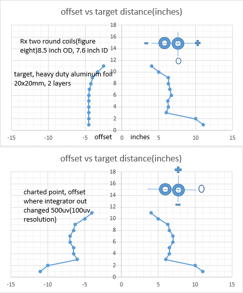 Decided I was interested. Charted all three targets(all 3.5usec TC). Hung target from a pendulum centered over test coil, adjusted target distance while target swung in test plane for a good indication. Included pendulum target distance on each chart.Originally posted by green View PostI've seen detection shape charts for DD and round coils. Not sure what the Y axis scale is. Was playing the other day and noticed the detection range was way outside the coil for shallow targets. Thought I would chart some data. Thinking three targets(40x40mm 1 layer)(20x20mm 2 layers)(10x10mm 4 layers) heavy duty aluminum foil. Should be same decay time constant for each target. Have charted signal strength at offset and target distance points in the past. Tried something different this time. Charted target offset that caused a 500uv change at integrator out at different target distances. A 500uv change is an easy signal to detect and gives some resolution vs trying to repeat a 100 or 200uv change. Charted the 20x20mm 2 layer target. Target was parallel to coil for all data points, offset measured from center of target. At lower target distances the null in the center is very narrow. Charted one end of the figure eight coil only, other end should be a mirror image. Any suggestions on how to chart detection shape better? Could chart the other targets if anyone is interested.Attached Files