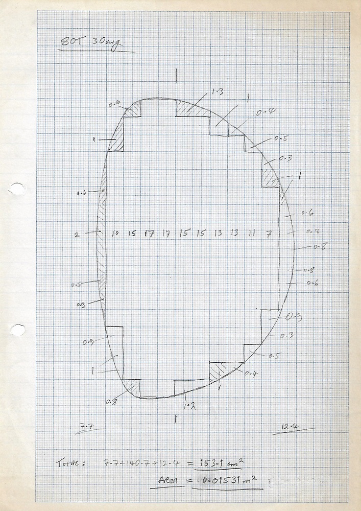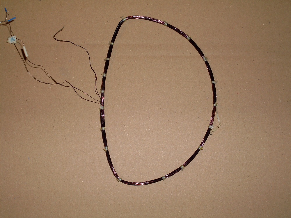 This is a roughly 'D' shaped coil with 80 turns (centre tapped) of 30swg wire, outside diameter 0.344 mm. To find the area it enclosed I drew the internal shape on graph paper - as this was an experiment I tried to get it as accurate as I could, which meant I ended up counting square millimetres. The area was 153.1 square centimetres.