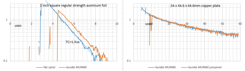 Used 1inch foil target(TC=1.5us) instead of 16mm square foil(TC=1us)spice model to get a higher signal for testing. Square target cut from regular strength aluminum foil(.063us TC/mm)*number of layers. About 16mm for 1us target. Square target cut from aluminum coke can side(.225us TC/mm). About 4.5mm for 1us target.