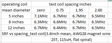 A test comparing SRF reading with different size PI Tx(operating coils)and different test coil spacing between operating PI coil. Test coil reply #86. Some variation but not much. Zero spacing with 5inch mean diameter operating coil surprised me.