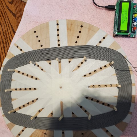 Having a TX coils, I now needed some RX coils and a way to support the assembly and provide an easy way to adjust (null) the RX coils. I decided on an assembly consisting of 4 layers of 3mm expanded PVC rigid foam: 3mm bottom plate, 3 mm RX coil layer, 3mm TX layer, and 3 mm top plate. The RX coils would slide in and out with a pinned slot to maintain alignment. The parts/formers for the 3 layers were produced on a 3018 CNC router. The RX coils were wound with AWG 30 enameled copper magnet wire and ended up being 303 uH.